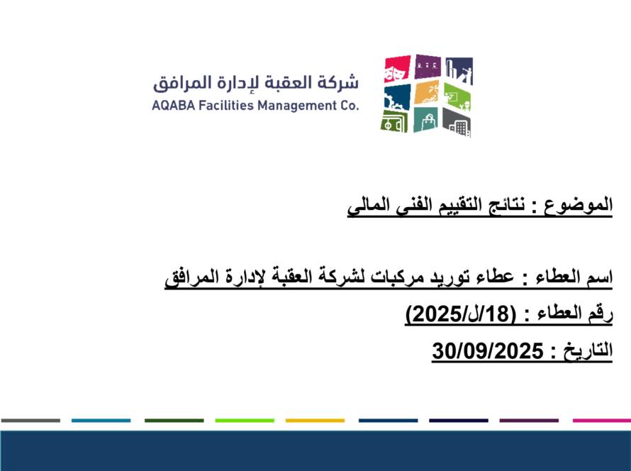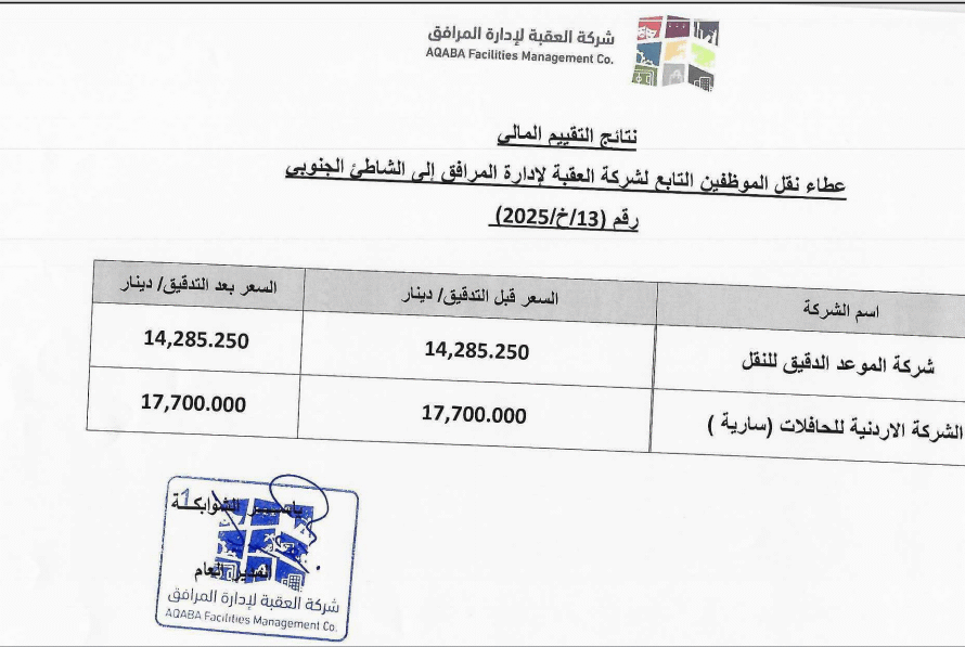 نتائج التقييم المالي لعطاء نقل الموظفين التابع لشركة العقبة لإدارة المرافق الى الشاطئ الجنوبي رقم (13/خ/2025)