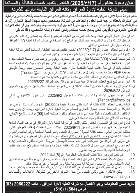 إعلان دعوة عطاء رقم (17/خ/2025) الخاص بتقديم خدمات النظافة والمساندة لمبنى شركة العقبة لإدارة المرافق وكافة المرافق التابعة إدارتها للشركة
