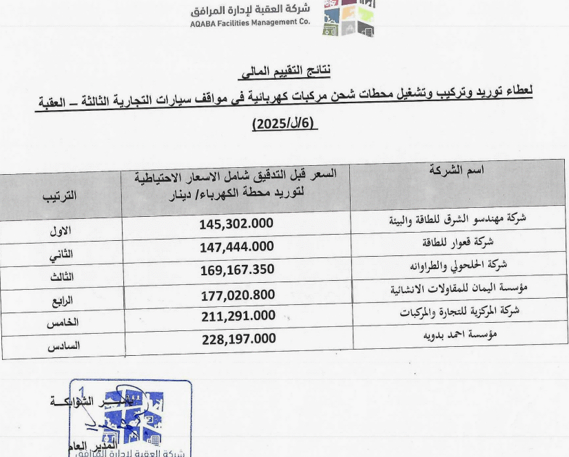نتائج التقييم المالي لعطاء توريد وتركيب وتشغيل محطات شحن مركبات كهربائية في مواقف السيارات التجارية الثالثة -العقبة ( 6 / ل / 2025 )