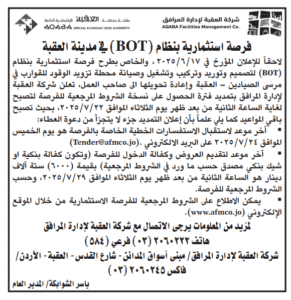 إعلان دعوة عطاء رقم (17/خ/2025) الخاص بتقديم خدمات النظافة والمساندة لمبنى شركة العقبة لإدارة المرافق وكافة المرافق التابعة إدارتها للشركة Read More » August 18, 2025